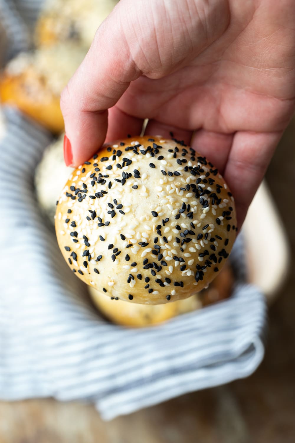 5. Lägg på en plåt och låt läsa i ca 1-2 timmar, tills de blivit lite större. Pensla med uppvispat ägg, strö över med sesamfrön och grädda i ca 12 minuter på 180 grader varmluft (200 grader vanlig ugn).