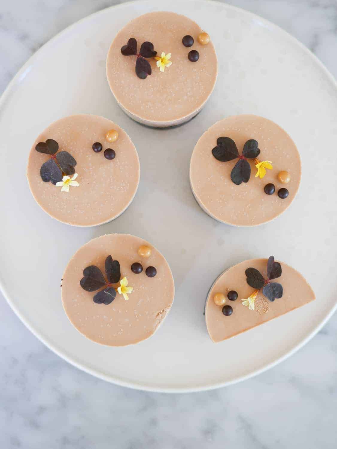Som vanligt har jag använt lite mindre gelatin än man egentligen behöver för att kunna hantera kakan. Det är för att jag verkligen vill ha den krämig, helt utan motstånd när man sätter gaffeln i den. Lägg därför kakan eller bakelserna på ett fat när de är frusna och låt dem tina i kylen utan att röra dem. De håller formen fint, men är känsliga för beröring, då blir de lätt märke i dem.